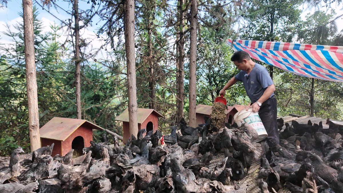除了草药保健,农场坚持“定点投喂 + 山间散养” 结合,每日定点投进玉米、豆粕等混合饲料,一同让五黑鸡在山林间自主啄食野草、野生芭蕉与昆虫。“这样既确保养分均衡,又能让鸡肉自带山林鲜香。” 黄元科说。