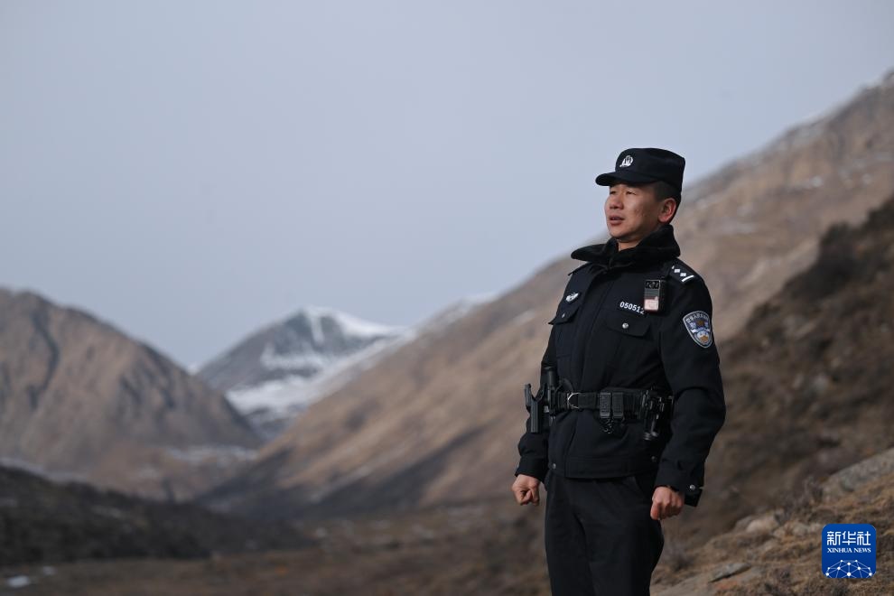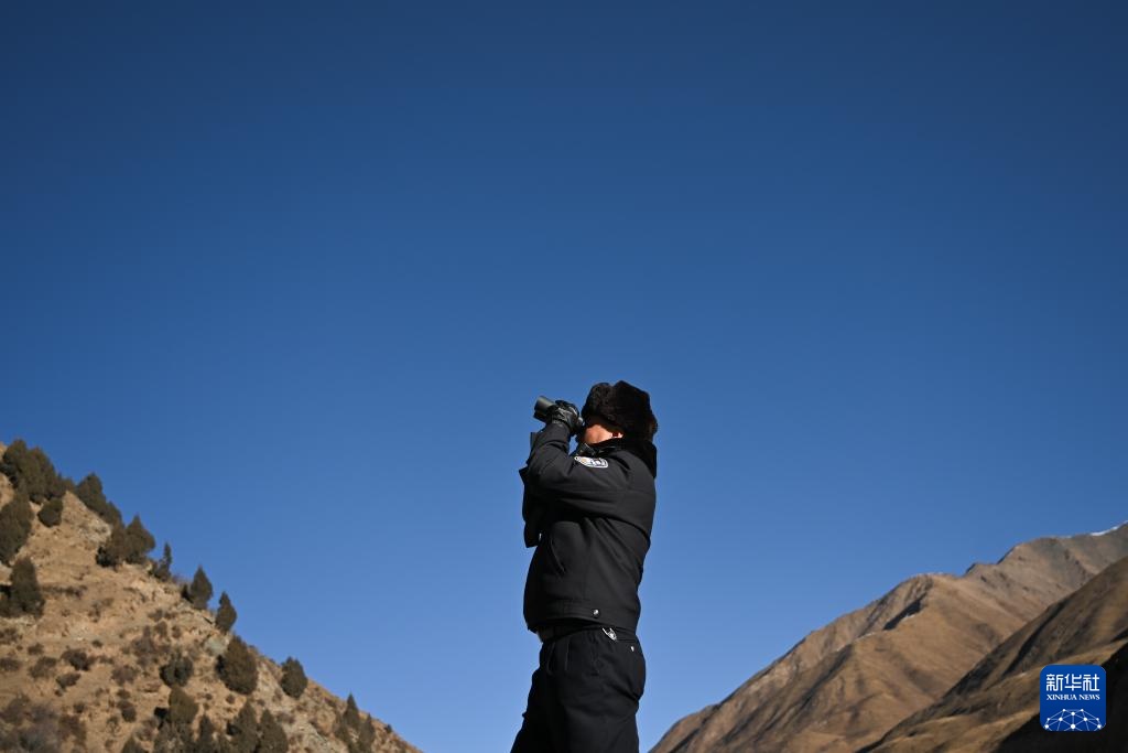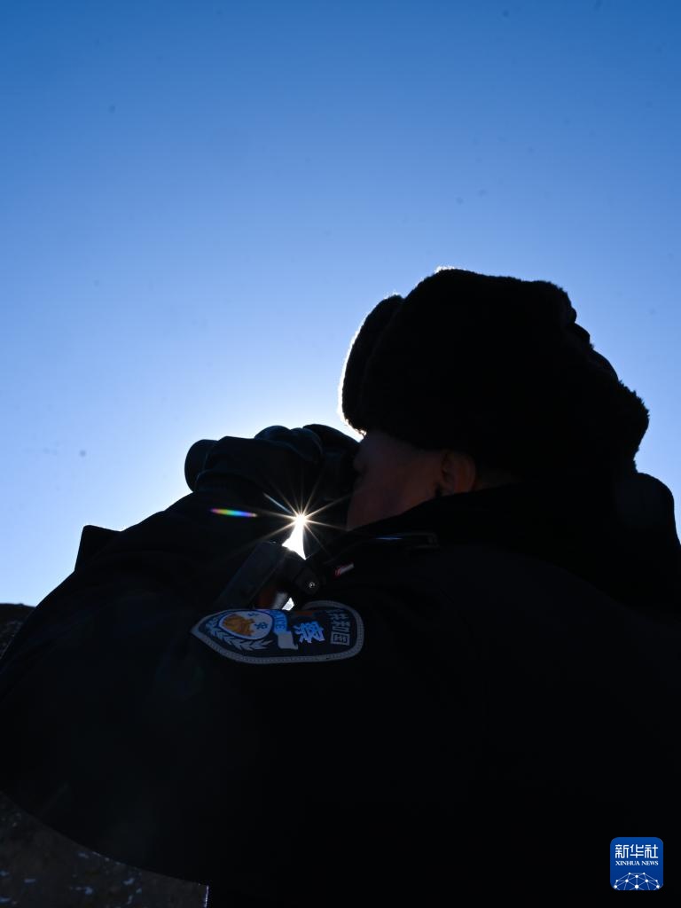 1月9日,在青海省海北藏族自治州门源回族自治县境内的老虎沟,民警郭建业用望远镜检查远处。