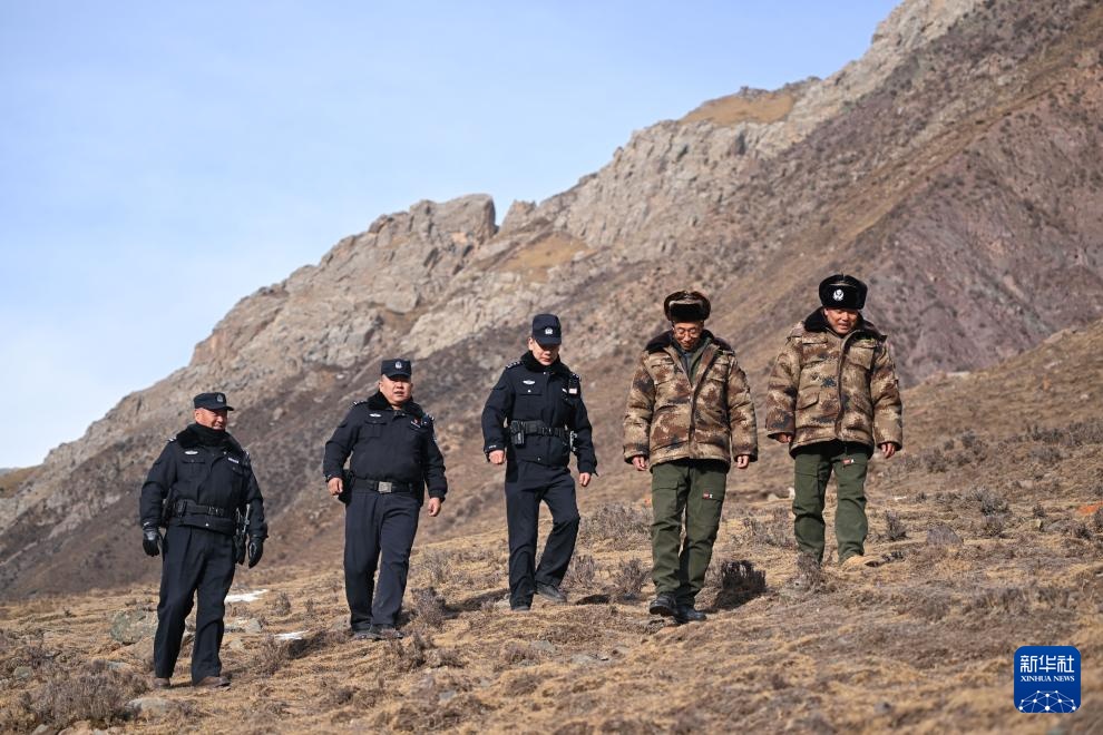 1月8日,在青海省海北藏族自治州门源回族自治县境内的老虎沟,民警和生态管护员在巡护中攀谈。