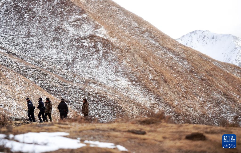 1月8日,在青海省海北藏族自治州门源回族自治县境内的老虎沟,民警和生态管护员在祁连山巡护。