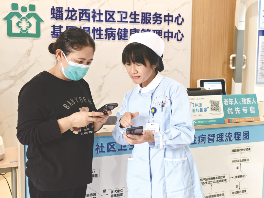 蟠龙西社区卫生服务中心作业人员辅导居民用手机处理相关事务。记者 蓝梦 摄